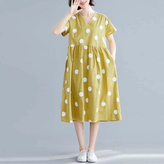 Dot Print Cotton Linen V-Neck Short Sleeve Dress