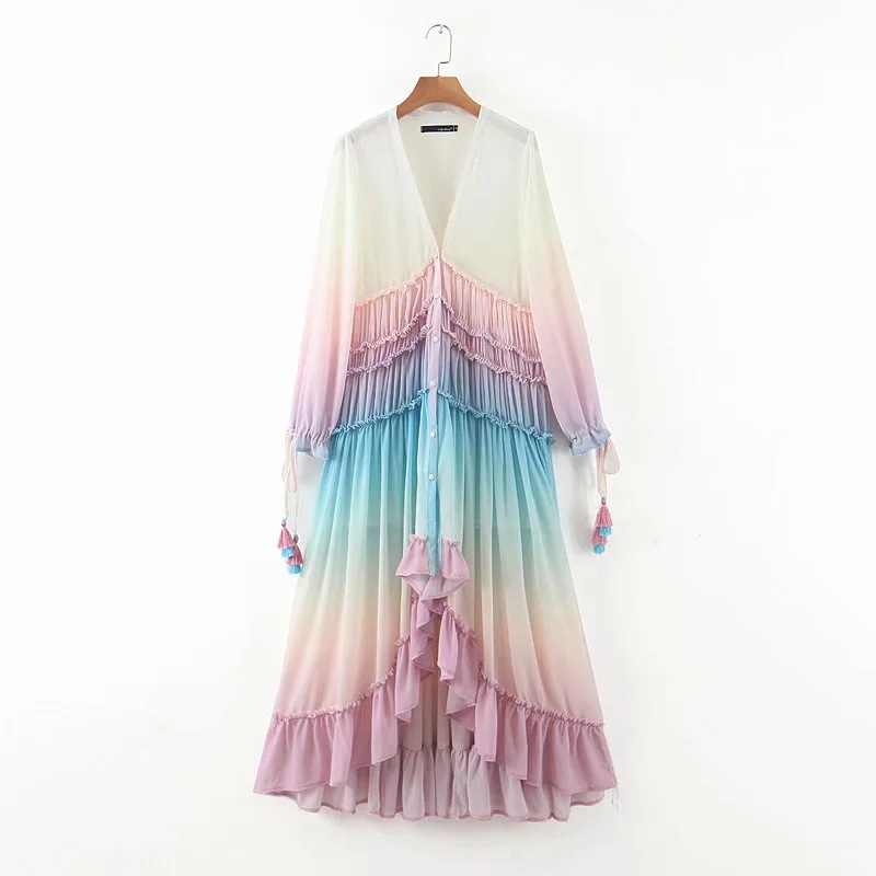 Bohemian Long Maxi Dress with V-Neck and Gradient Color