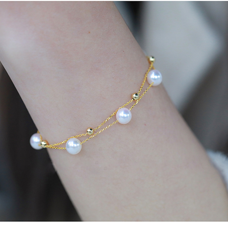 With its unique double-layer design, this bracelet not only adds a touch of elegance to any outfit but also ensures maximum durability and comfort. The pearls beautifully complement the gold, creating a striking contrast that enhances your style.