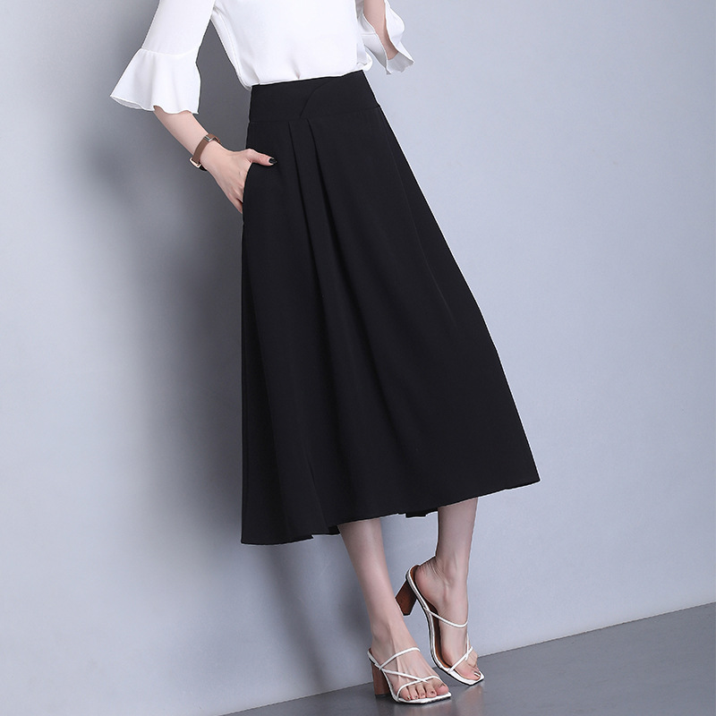 Featuring a chic plain pattern and a large swing type design, this skirt offers versatility for any occasion. The added convenience of pockets and unique stitching details enhances its appeal, making it a practical choice for both casual outings and more sophisticated settings.