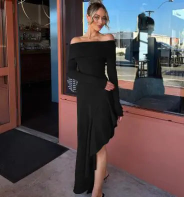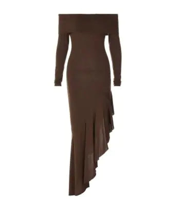 Off-Shoulder Long Dress – Featuring a solid color and flounced skirt design, this elegant mid-length dress comes in brown, black, and white. Made from 95% polyester and 5% spandex, it offers a comfortable fit with a mid-waist style. The off-shoulder tube top adds a chic touch, perfect for a sophisticated, commuting look. Available in sizes S, M, and L, with a soft imitation cotton fabric and trendy wooden ear details. Please check the size chart before ordering, as Asian sizes may run smaller than European and American sizes.
