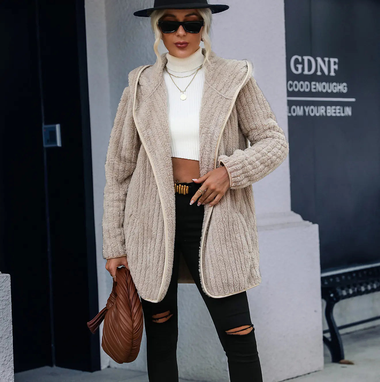 Elevate your wardrobe with our versatile Hooded Edge Binding Reversible Plush Cardigan, designed for the modern urban lifestyle. Made from high-quality polyester, this cardigan combines comfort and style effortlessly. The chic light coffee color adds a touch of sophistication, while the hooded design and loose fit ensure you stay cozy and stylish no matter the occasion.